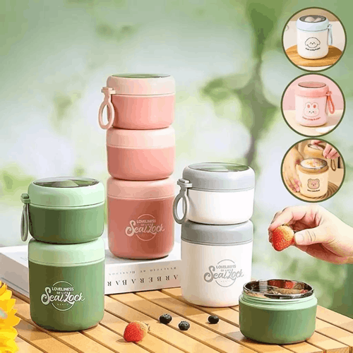 Isso aqui é vida. Usamos para levar frutas, iogurtes e saladas para nossa rotina diária. É de aço inox e veda muito bem.
