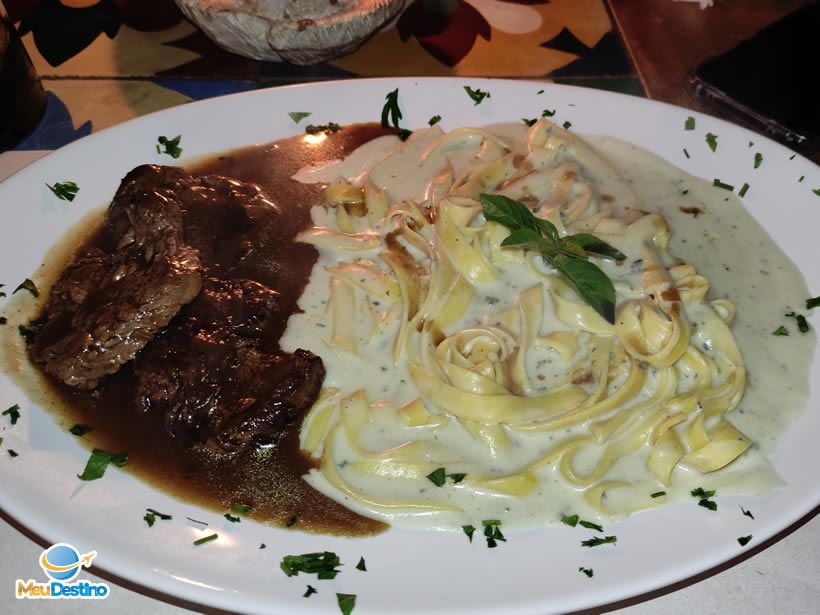 Para o prato principal, foi difícil escolher em meio à tantas opções que sabemos que são ótimas, mas optamos pelo Fetuccine ao Gorgonzola com Escalopes de Filé (R$52), com o fetuccine fresquinho produzido no próprio restaurante, prato com um sabor incrível. A massa estava impecável, o molho gorgonzola delicioso e o filé super macio, no ponto ideal. O prato é individual e serve super bem. Planejamos uma sobremesa, mas ficamos tão satisfeitos que acabamos não pedindo.